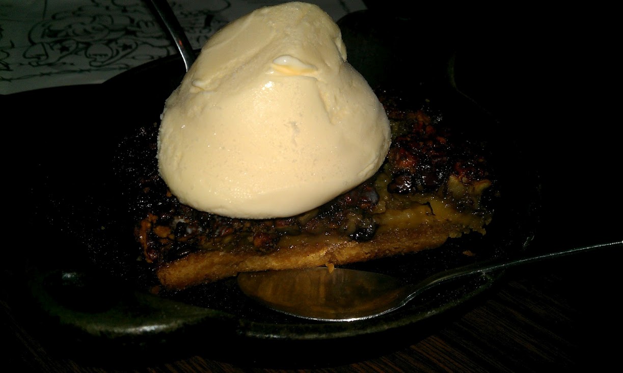 So, I mentioned that I saved some calories for dessert. Oh yes, I did. They had Goodnight Cobbler, Banana Pudding, and then what I ordered: Texas Pecan and Chocolate Chip Cobbler. Oh yes, I did order it. It was such a shame (a glorious shame bwahaha) that hubby stuffed himself on his food and that the kiddos had their own desserts. Poor thing, I had to eat the whole thing myself! It was served in a hot cast iron mini skillet and was piping hot with a cool dollop of Blue Bell vanilla ice cream. Heaven.