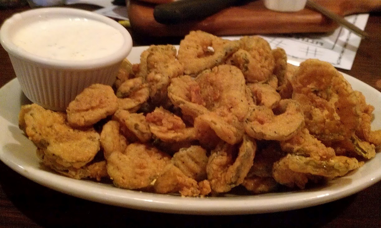Once seated, our server came up and started taking care of us. Since we indicated that it was our first time, he went over the menu with us a bit and made a few recommendations, such as Sal’s Special Ribeye and the No Bull Mushrooms. After debating back and forth, we finally decided to order some Fried Pickles as our appetizer. Oh my gosh. During my last pregnancy, I tried them for the first time at a local dive and crave them all the time now even though I’m not pregnant anymore. YUMMM! These didn’t disappoint and the portion was very generous.