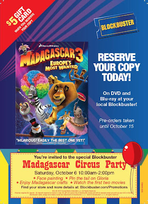 Check it out! Reserve your copy of Madagascar 3 on DVD and Blu-ray at Bockbuster and receive a $5 gift card! The movie comes out October 16th. Not only that, but this Saturday (October 6th) from 10am-2pm, Blockbuster will be holding a Madagascar Circus Party with face painting, crafts, and more. Check out your nearest participating location here.